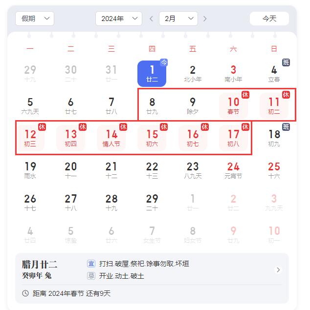 2024年2月8日 (星期四)中午至2月17日(星期六),放假時間為9天半。2月4日(星期天)、2月18日星期天為調(diào)休時間公司正常上班。